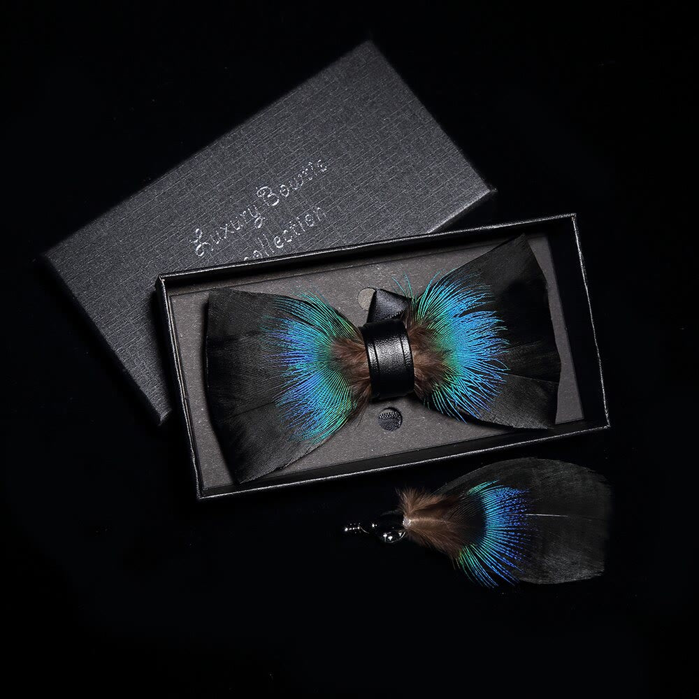 Black & Blue Versatile Feather Bow Tie with Lapel Pin