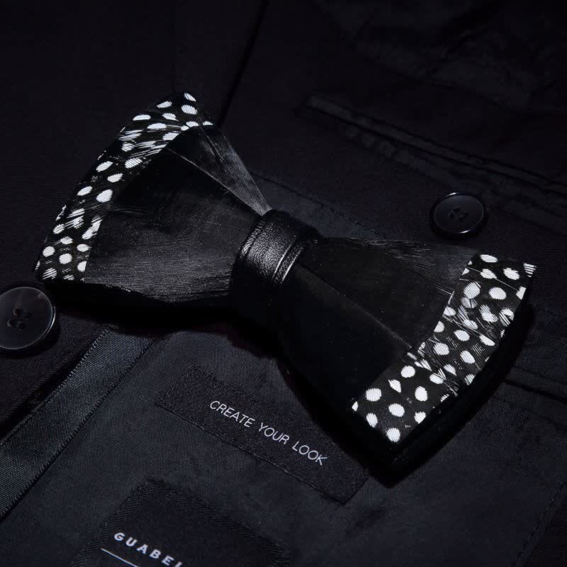 - Features: This black and white polka-dotted feather bowtie adds a unique flair to the standard all-black bowtie. The embellishments of white polka dots add playful flavor. It's simple, sexy, and makes you stand out in the clowd.